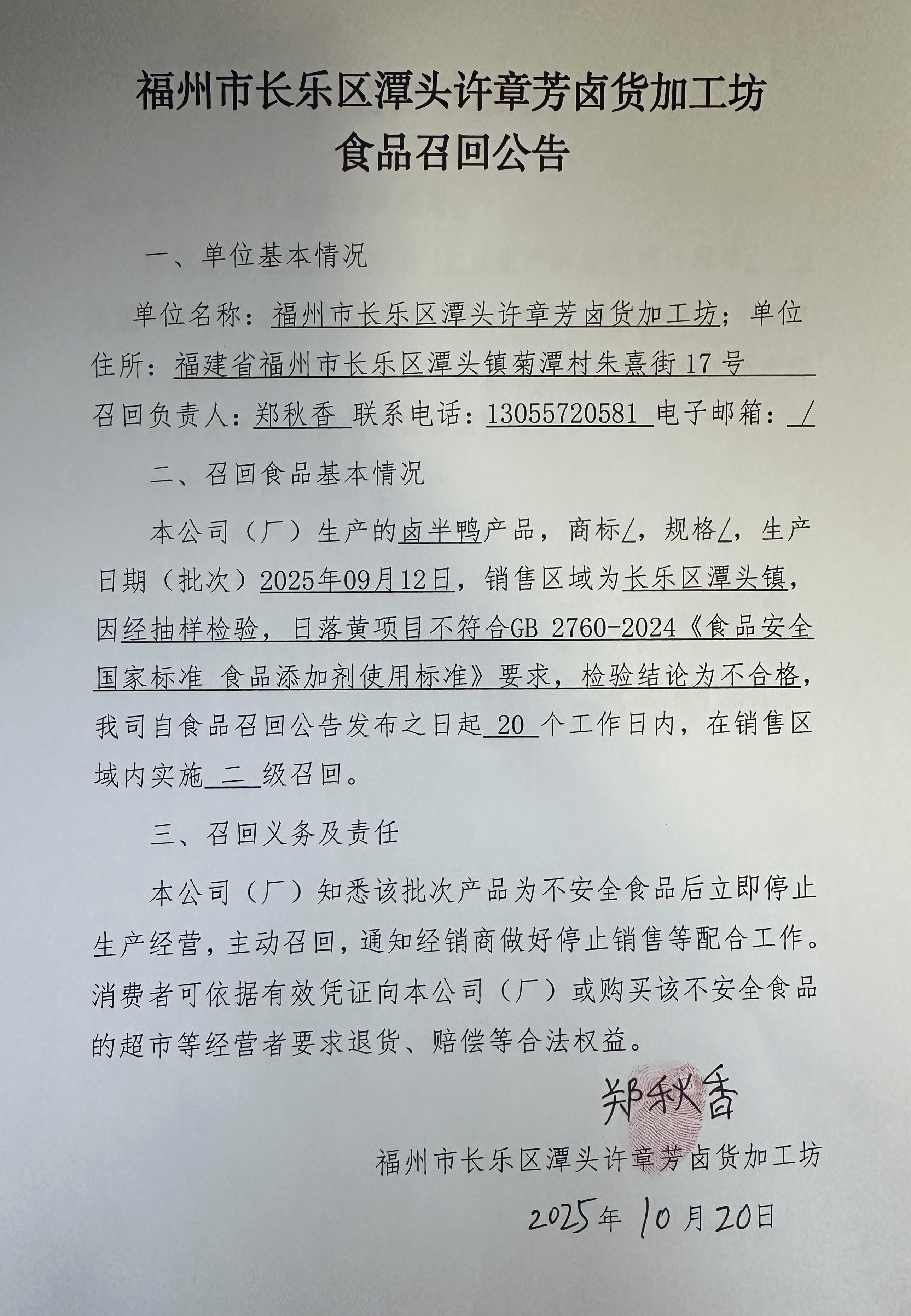 福州市长乐区潭头许章芳卤货加工坊食品召回公告(20251020)
