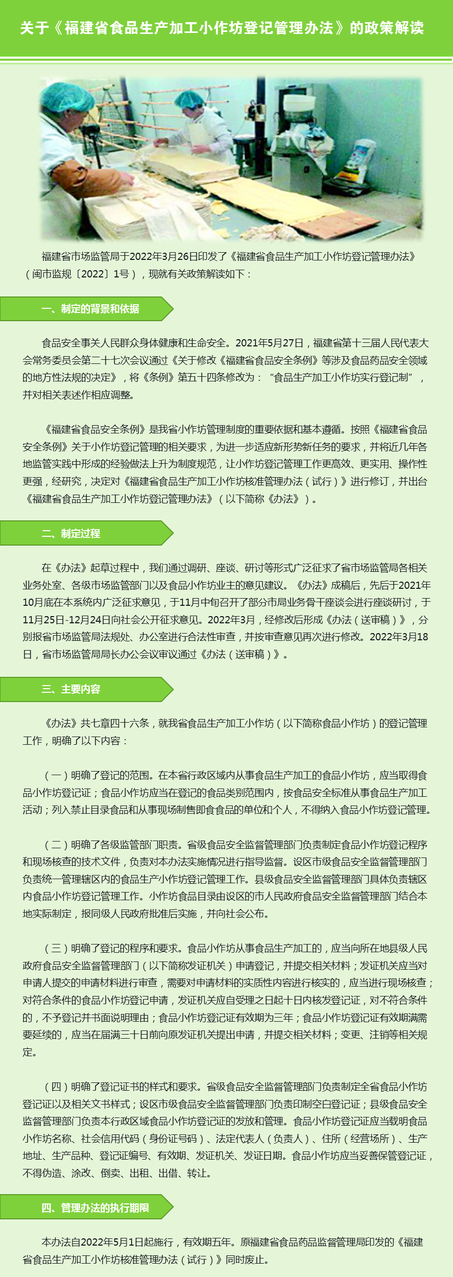 福建九色视频 于2022年3月26日印发了《福建省食品生产加工小作坊登记管理办法》(闽市监规〔2022〕1号),现就有关政策解读如下: